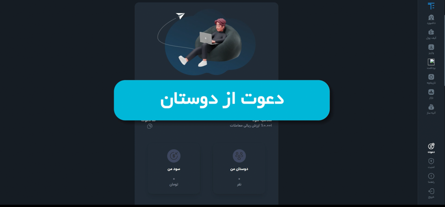 امکان دعوت از دوستان به شکلی انعطافپذیر و سودآور فراهم شده است. شما میتوانید پیش از ثبتنام، کد رفرال خود را در اختیار دوستانتان قرار دهید تا هنگام عضویت از آن استفاده کنند و مزایای ویژه دریافت نمایند. همچنین اگر کاربری پس از ثبتنام بخواهد به برنامه دعوت بپیوندد، میتواند کد معرف یکی از اعضای فعال را وارد کند و از این فرصت بهرهمند شود. در هر دو حالت، درصدی از معاملات دوست دعوتشده بهعنوان پاداش به حساب معرف واریز میشود. این روش علاوه بر پویا کردن جامعه تتربانک، راهی بهینه برای تعدیل قیمت ها به شمار می آید