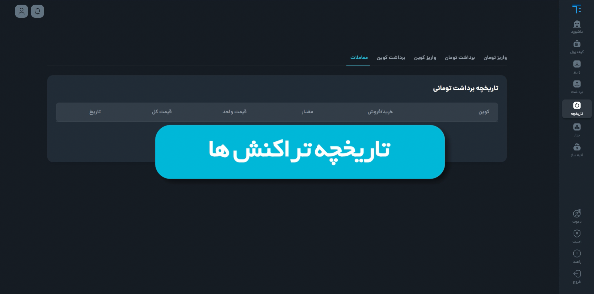 تمام تراکنشهای شما، از واریز و برداشت تا معاملات، بهطور کامل و شفاف در این بخش ثبت میشوند. با استفاده از تاریخچه تراکنشها میتوانید در هر لحظه کنترل کامل بر داراییها و فعالیتهای خود داشته باشید. این امکان به شما کمک میکند تا روند ورود و خروج کوینها، جزئیات معاملات و وضعیت کیف پولتان را بهسادگی بررسی کنید. طراحی این بخش ساده و کاربرپسند است تا بدون سردرگمی بتوانید تمام اطلاعات مورد نیازتان را به سرعت مشاهده کنید. امنیت دادهها و ثبت دقیق هر تراکنش، تضمین میکند که شما همیشه تصویر روشنی از فعالیتهای مالی خود داشته باشید.